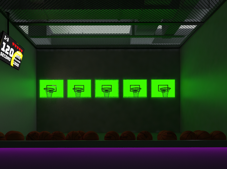 Players throw basketballs into hoops that match the displayed colors, avoid obstacles that cost valuable points.
